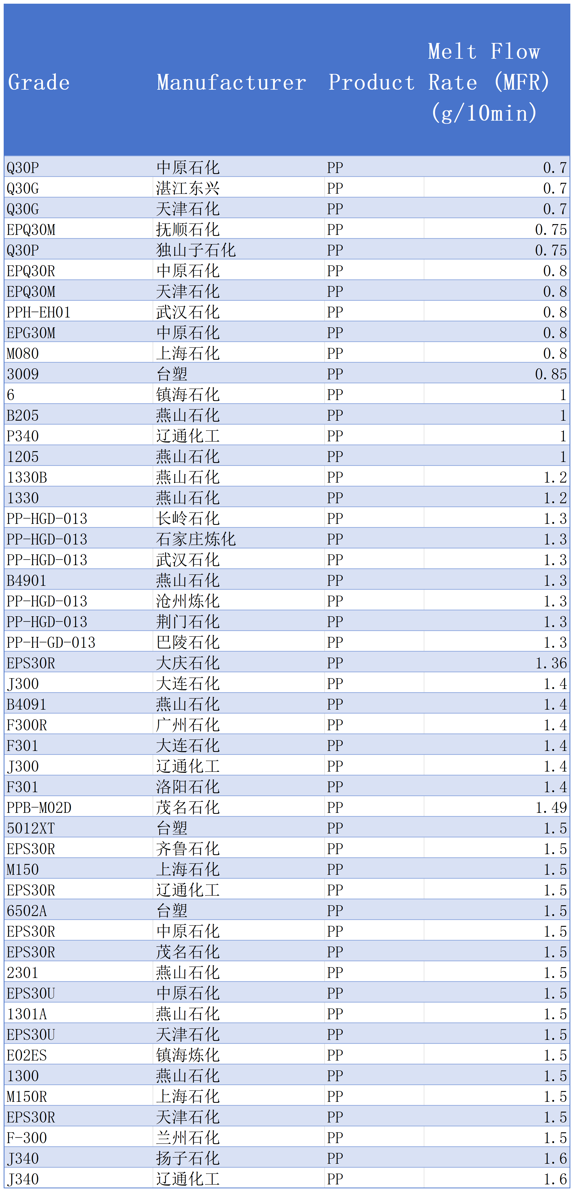The melt flow index of some domestic PP grades is shown in the table below:
