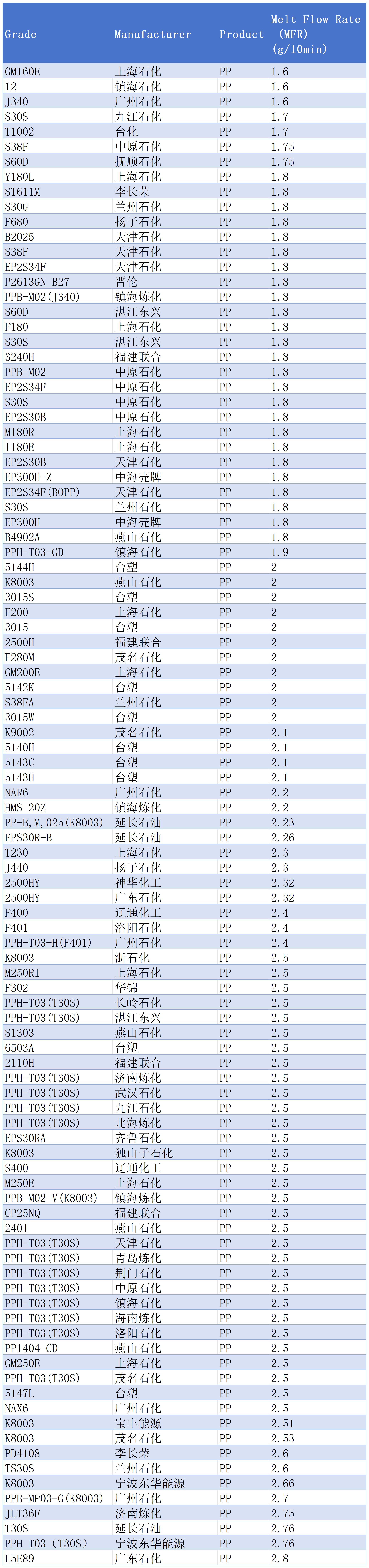 The melt flow index of some domestic PP grades is shown in the table below: