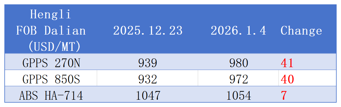 In the first week of the new year, Hengli Dalian's FOB quotations showed a broad upward trend. Among them, GPPS prices increased significantly with a relatively large gain, while ABS prices also rose slightly, showing a relatively moderate change.