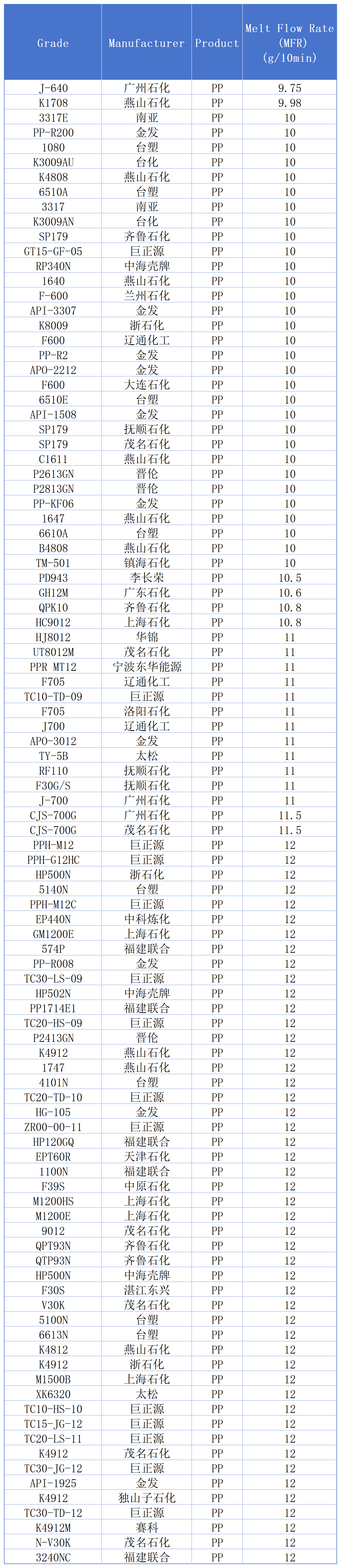 The melt flow index of some domestic PP grades is shown in the table below: