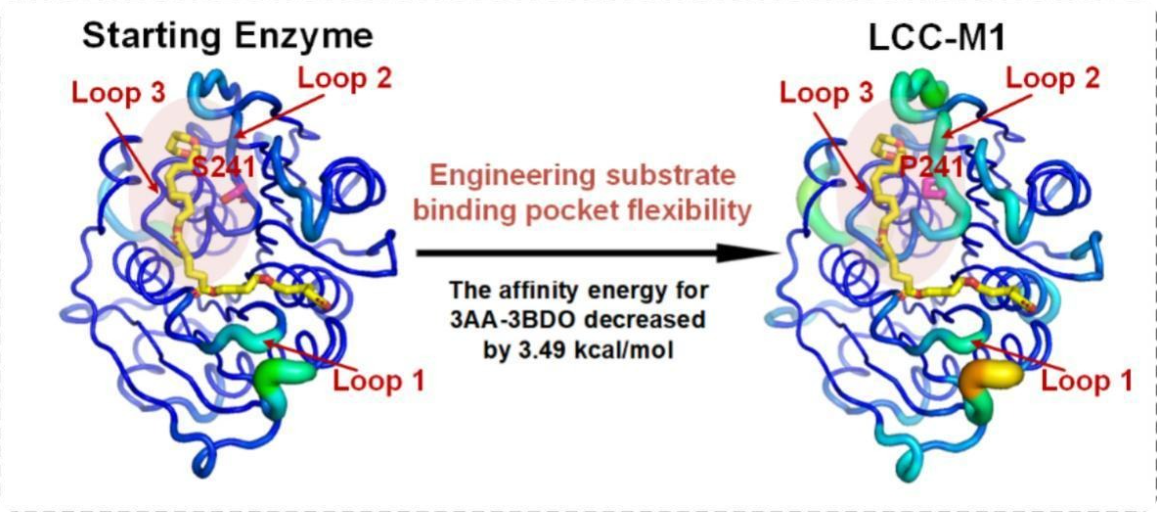 PBAT分子内含有脂肪族和芳香族两种不同的酯键结构,因此,开发一种能同时高效降解这两种酯键结构的塑料水解酶是高效回收PBAT塑料废弃物的关键。此前,本团队开发出一种降解PET塑料的高效降解酶LCC-A2(ACS Catalysis, 2024),能够在3.3小时内降解超过90%的消费后PET塑料废弃物。在本研究中,通过增强LCC-A2底物结合口袋关键loop区的柔性,提高对于PBAT底物的适配性,获得了突变体LCC-M1。该突变体对PBAT的两种酯键均展现出卓越的降解能力,能够在4 h内彻底降解未经任何预处理的商品化PBAT薄膜,在3 h内完全降解商品化的PBAT/PLA共混塑料袋,且超过99%的降解产物为最终降解产物,LCC-M1是目前报道的最高效PBAT降解酶。本研究开发的塑料降解酶底物结合口袋改造策略与所获得的PBAT降解酶突变体,对解决日益严重的塑料污染问题具有重要意义。