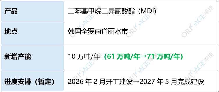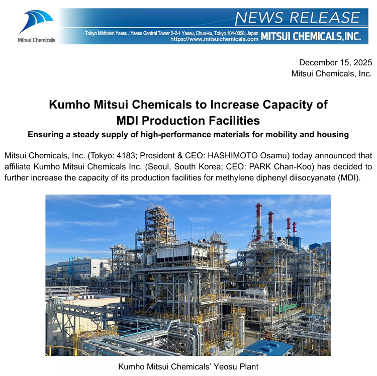 2025年12月15日,三井化学株式会社在其官网宣布,其关联公司「锦湖三井化学株式会社」决定进一步提升其二苯基甲烷二异氰酸酯(MDI)生产装置的产能。