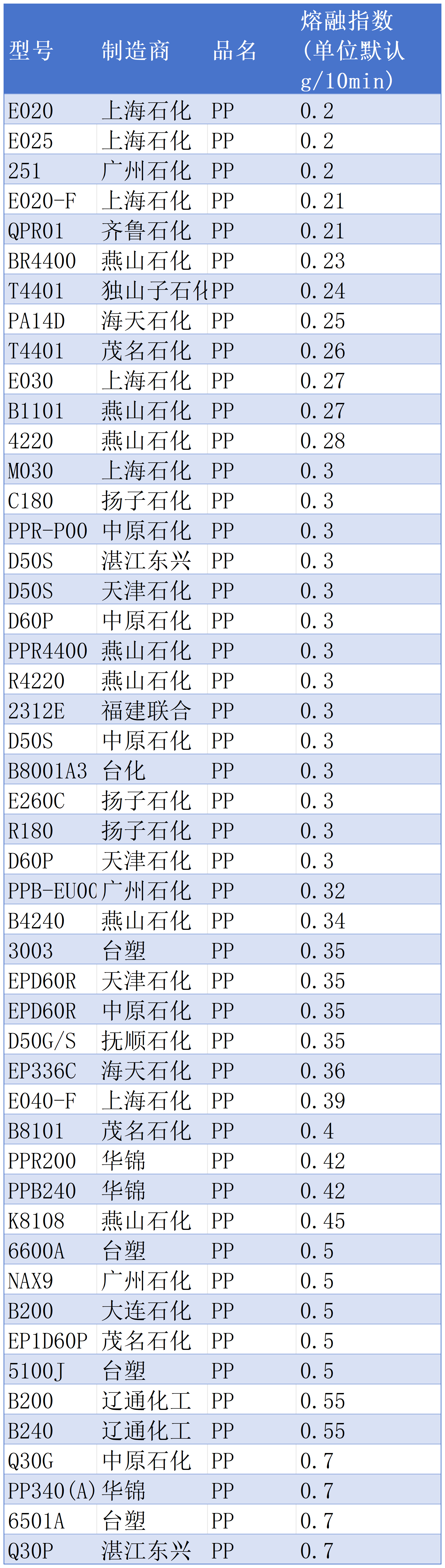 部分国产PP型号熔融指数如下表所示: