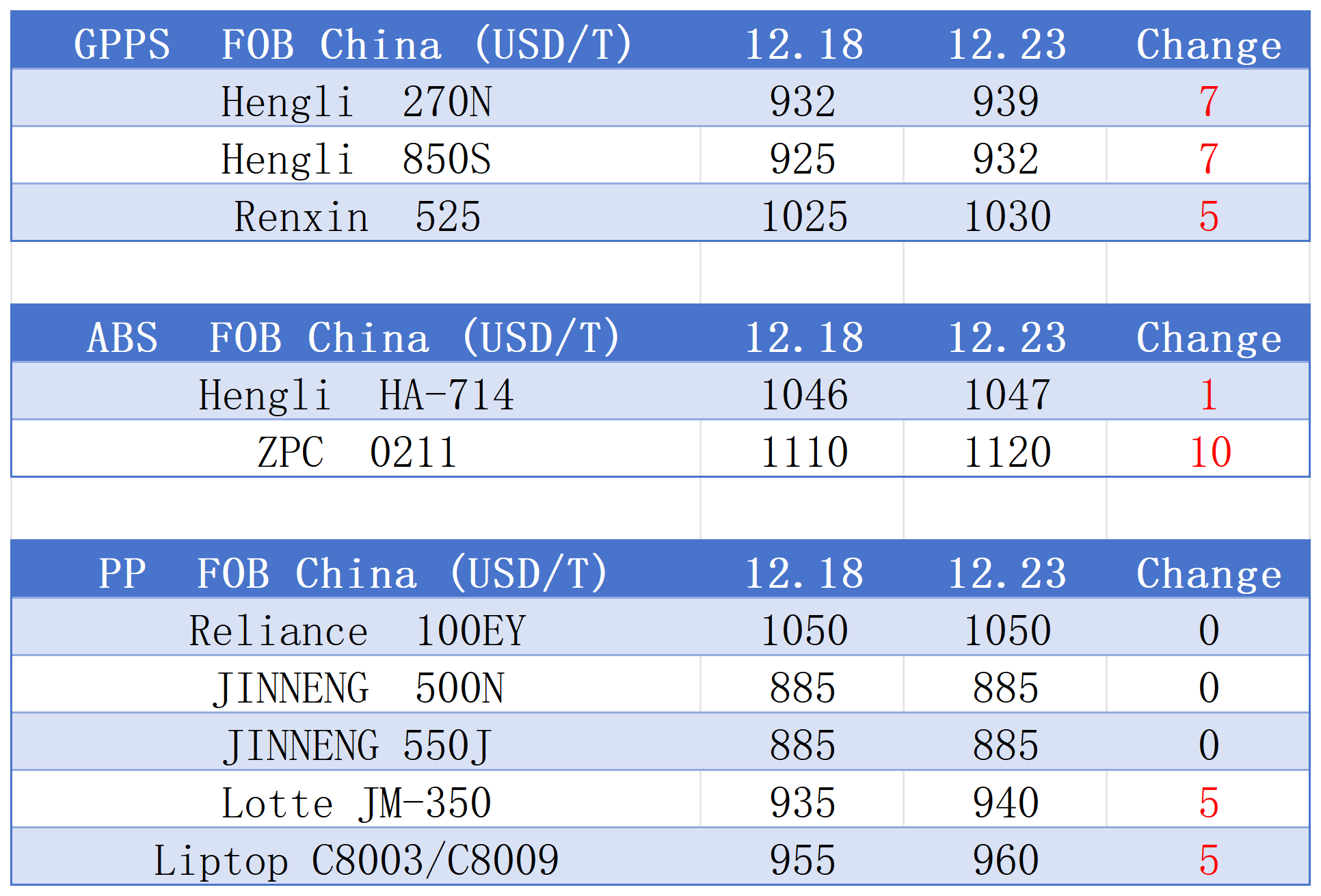 表中数据显示,GPPS与ABS主流牌号价格有所上涨。PP市场主流牌号价格以持稳为主,个别价格小幅上涨。